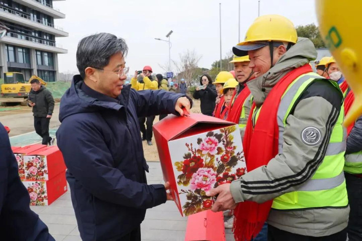 最后,方国强一行来到常州行知云商食品有限公司以及常州市建筑科学研究院集团股份有限公司检验检测总部建设项目工地,为坚守在岗位一线的外卖送餐员和一线工人们送上慰问品、慰问金,感谢他们为城市的繁荣与建设作出的贡献,祝愿他们工作顺利、身体健康、阖家幸福。